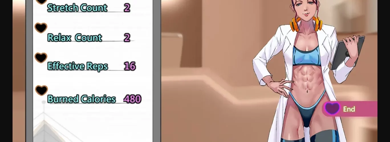 A daily late-night erotic muscle training simulation game with a beautiful personal trainer.
