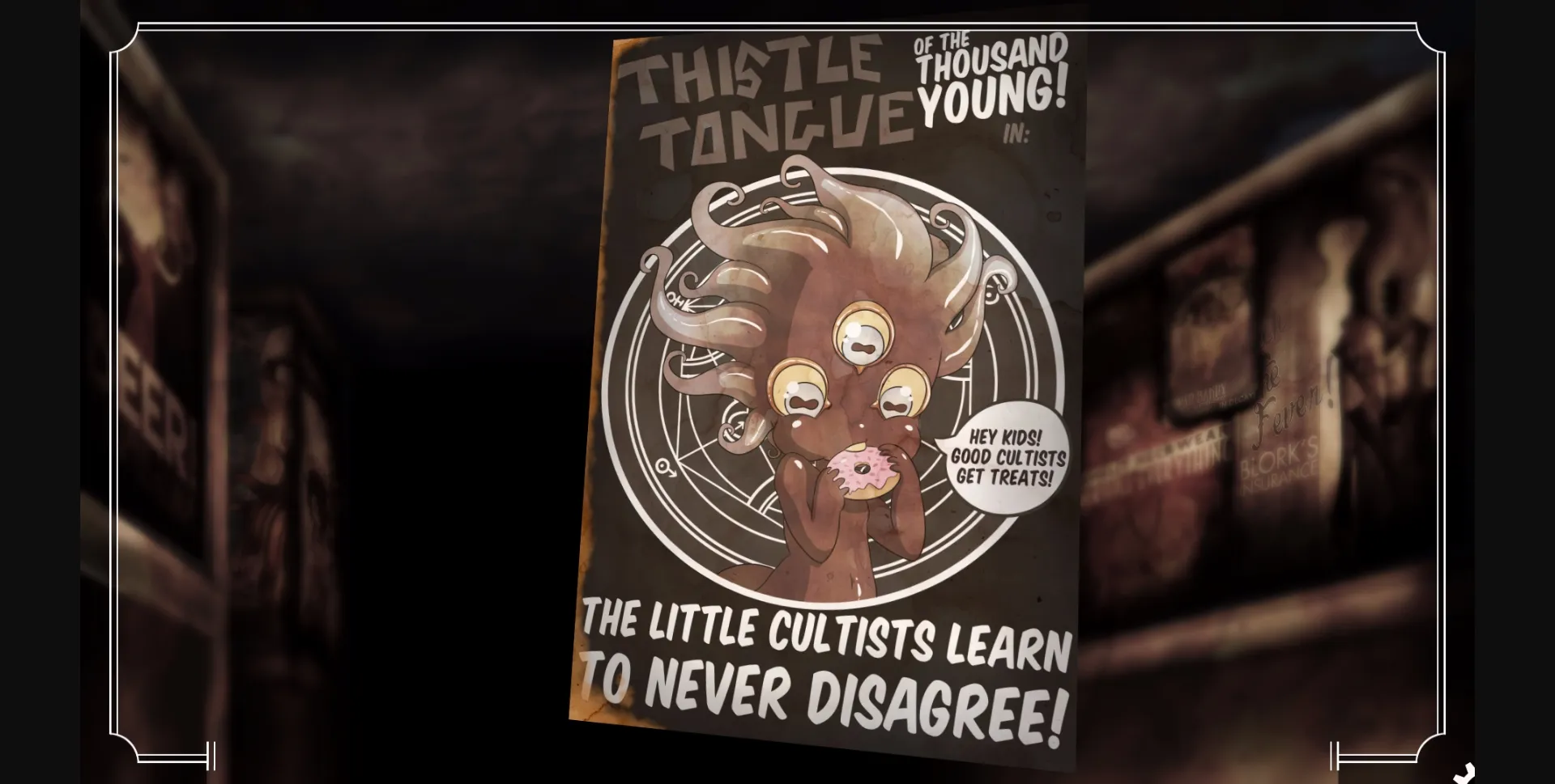 Charlotte LeStrange, a former member of the Chesuncook witch cult blessed with magically mind-altering eyes, has been recently hired by The Miskatonic to perform errands for the mutated faculty and patrol the Occult Science wing of the university. A bubbly and inquisitive sort, Charlotte is fascinated with the monsters and mutants of the stories and spells, and a job at The Miskatonic seems like a dream come true! Though behind the supernaturally disfigured staff, the unusually invasive science teachers, and the adorably horrifying cosmic abominations known as the Dunwichers, hides a vast, nightmarish conspiracy that only Charlotte herself is equipped to solve!