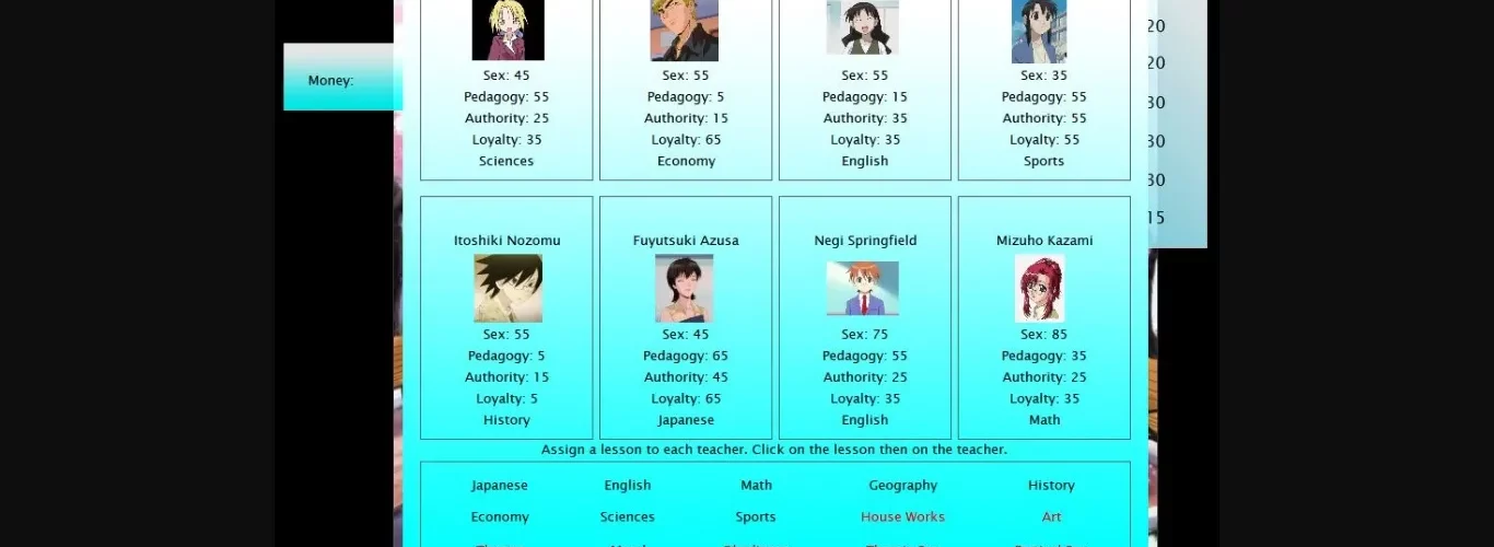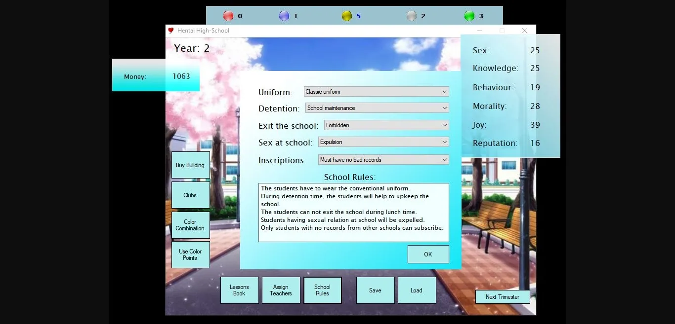 Due to some convenient circumstances, you became principal of a high-school at age 23. After a bet with a friend of yours, you have to transform the school into a hentai-school, where the students would become sex-maniacs. You have 15 years to do so. Good luck.