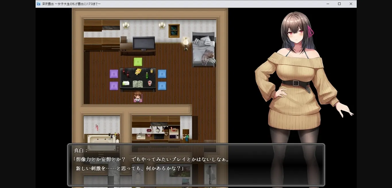 In order to satisfy her desire to masturbate, she begins a life of exposure play, even though she understands that it is not a good thing to do.