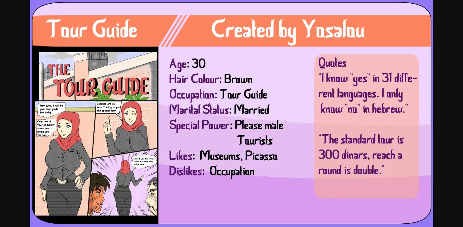 Demo of a game I’m making, roughly translates to “Train my Wife”. You take the role of a talent manager who’s tasked with turning this buxom hijabi housewife into a star.