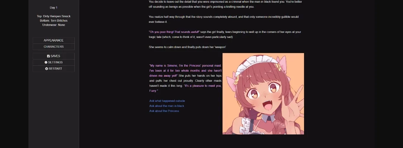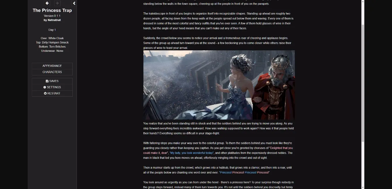 The Princess Trap is an erotic, fantasy, narrative-heavy, slow-burn, interactive story featuring themes of feminisation, slow MtF transformation, submission, and crossdressing, as well as milder themes of sissification, corruption, bimbofication, exhibitionism, and humiliation.