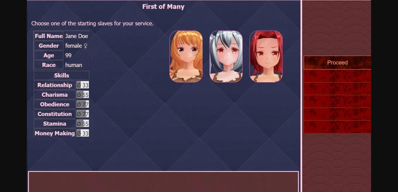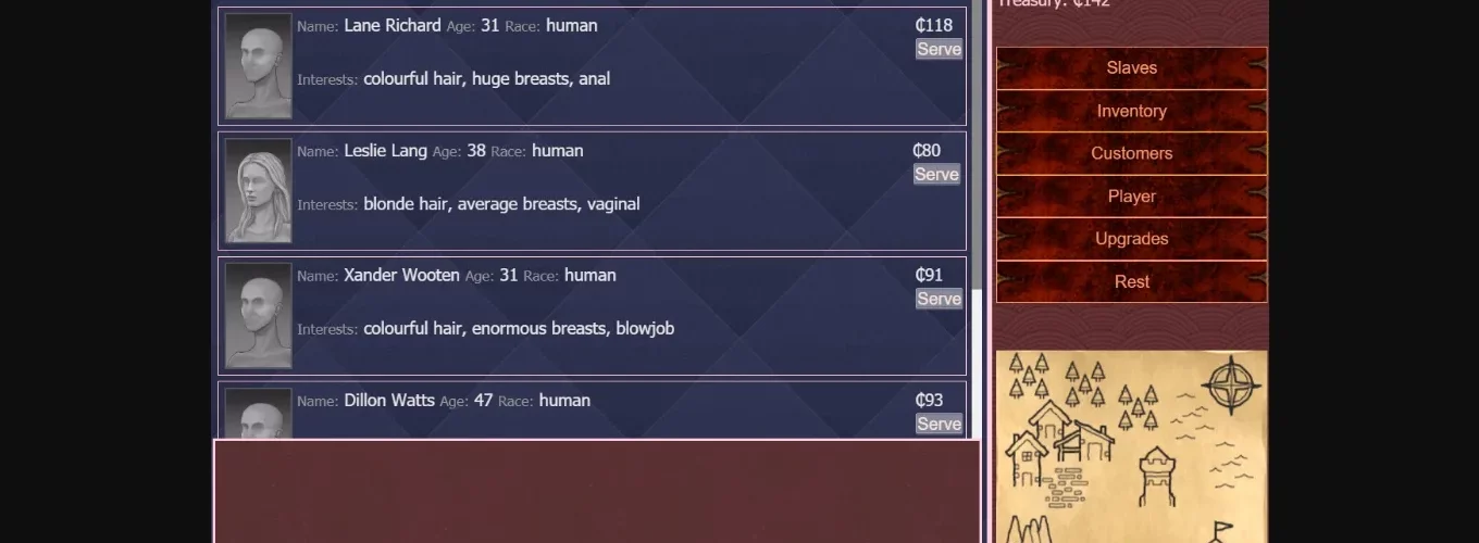 Kazatzka is a fantasy medieval brothel simulator with slave training elements sprinkled in. You, as the player character, offer your slaves to customers coming to your brothel and can also have them to yourself in your free time. Initially you start off in a small house with limited capacity for anything in a farmland, but through upgrades you get to a far better place. There are item and slave trading and different sexual preferences each customer would like.