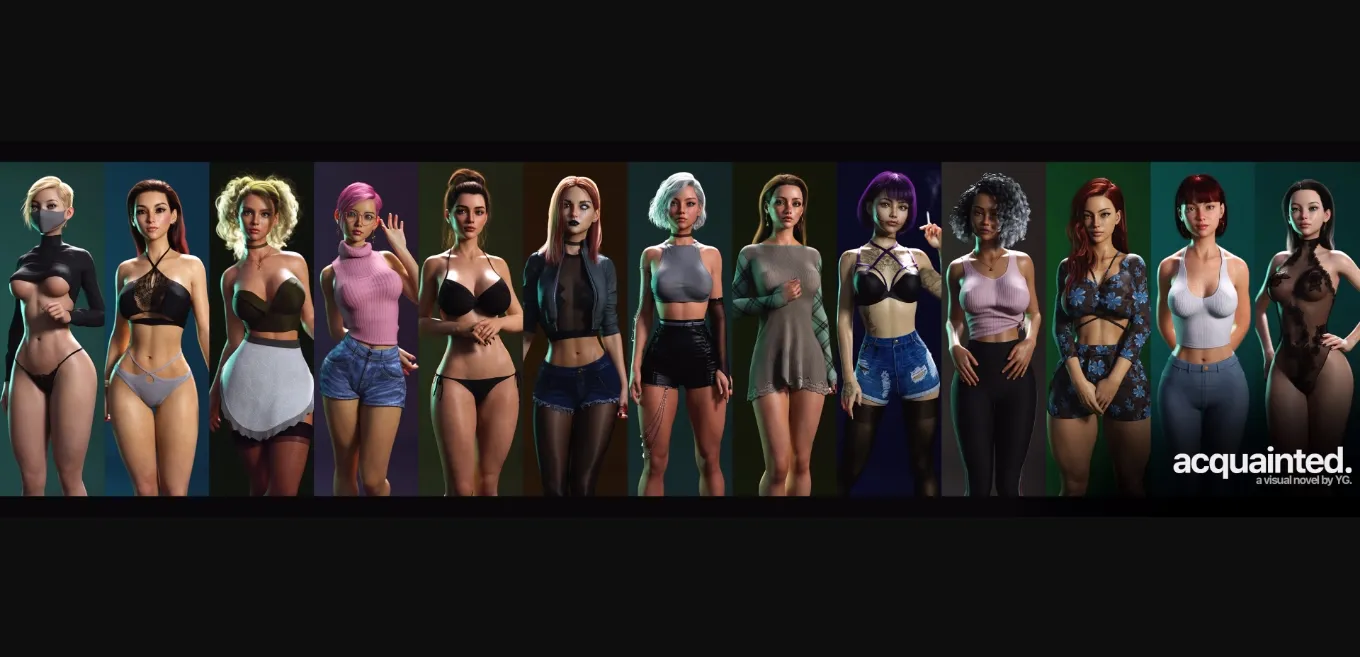 Acquainted is an episodic adult VN centering around mystery, romance, corruption, and storytelling.