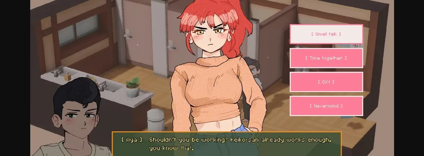 • 6 new events, 3 for Chiharu and 3 for Keiko (you spend more time with Aya tbh, but still the event advances Keiko’s plot). 3 CGs (2 Chiharu, 1 Keiko). One ecchi, rest wholesome. Keiko has two chained events, and took a bit of experimentation to do right. The game will let you know when you have to buy something to continue.