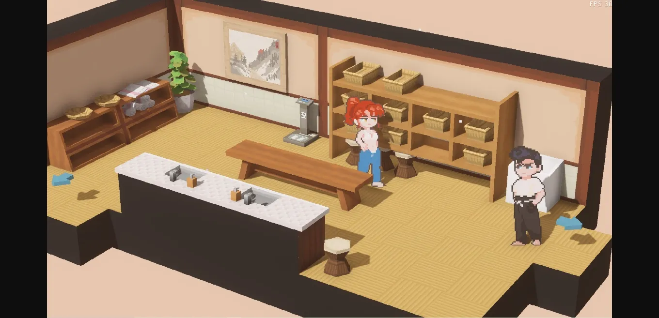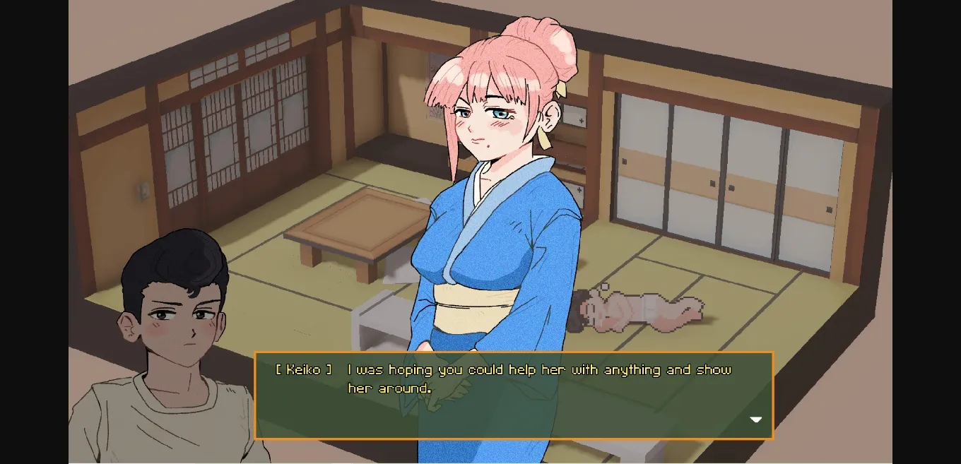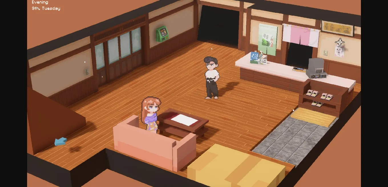 • The first guest couple (Misaki and Kenichi) now appear around the ryokan while staying. No work on dialogue or actions.