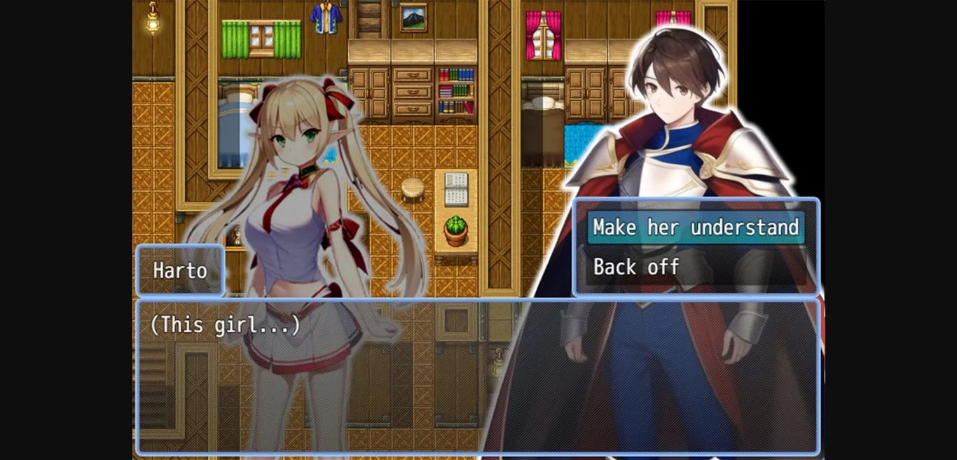 The protagonist, who wanders into a village inhabited only by female elves, embarks on a mission to impregnate every elf in this erotic game made with RPG Maker.