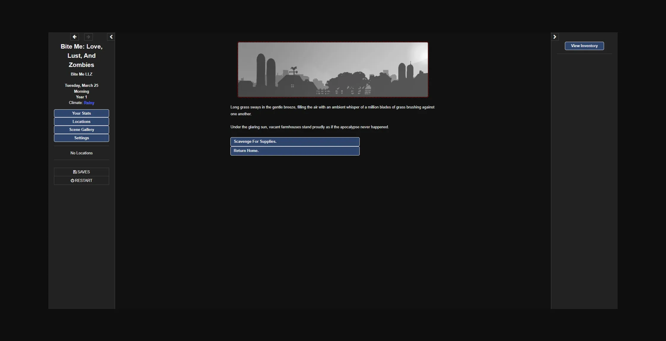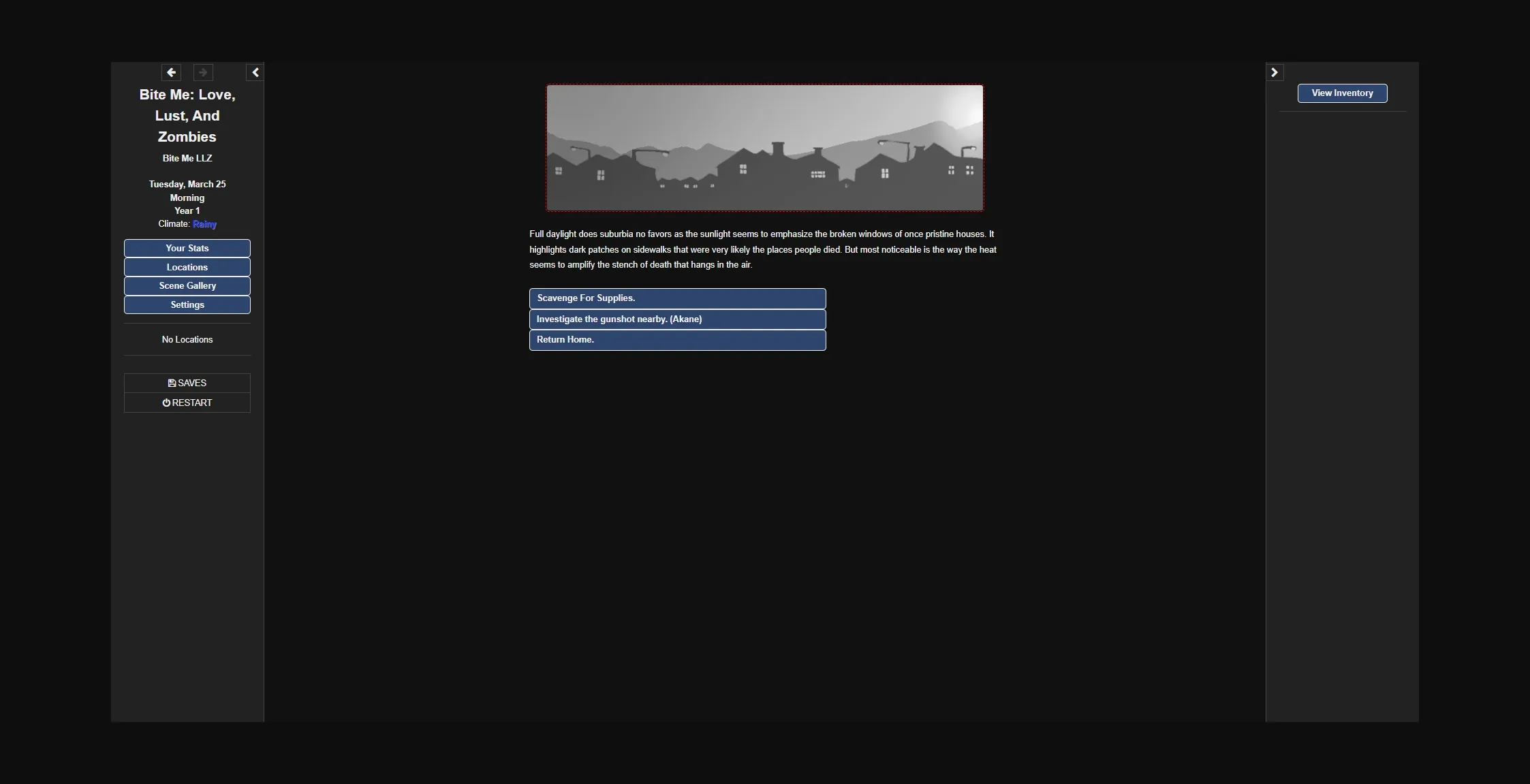 - Added four new dying scenes. 2 for if you have reached 10 infection (1 for when you are out and about, and 1 for home), and 2 for if you have 0 health (1 for when you are out and about and 1 for home).