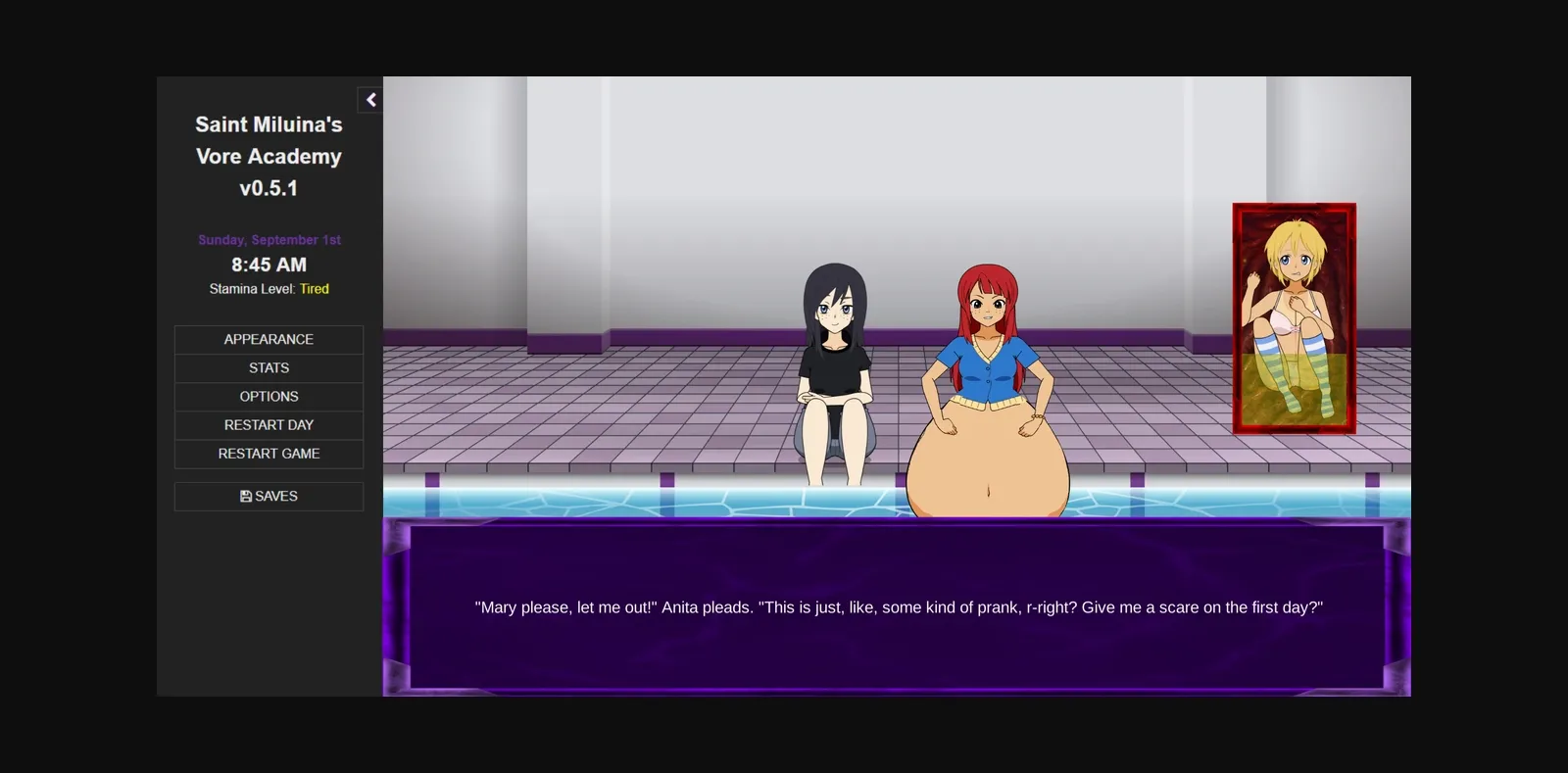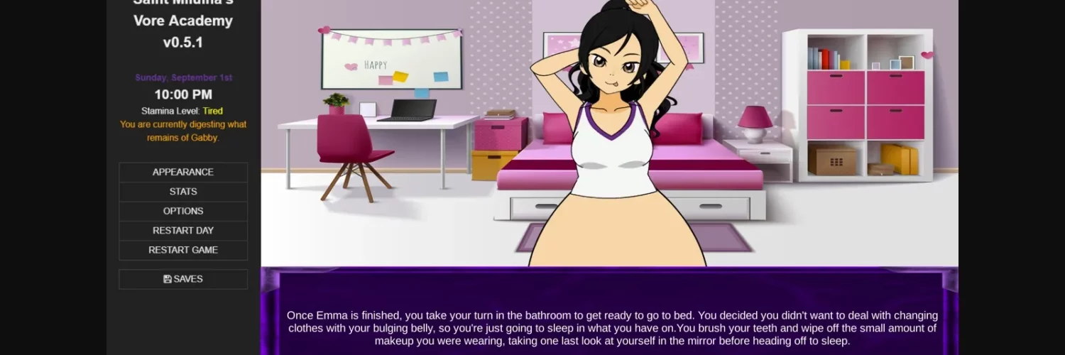 SMVisualA is a mod for OsmiumOrchid’s superb text adventure Saint Miluina’s Vore Academy. It adds graphics, sound effects, and simple animations to bring the experience closer to a visual novel. Saved games are compatible between SMVisualA and the browser game.