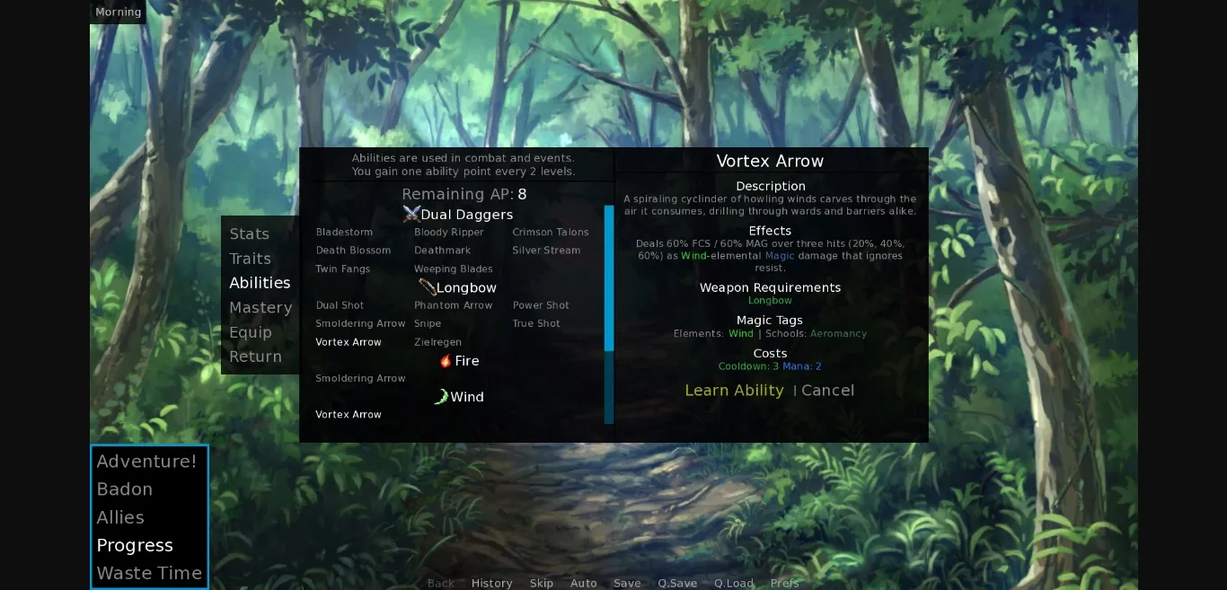 • Abilities are now sorted within an element by school. Martial arts are now color-coded by school as well – if people like it, I can do the same for magic schools.