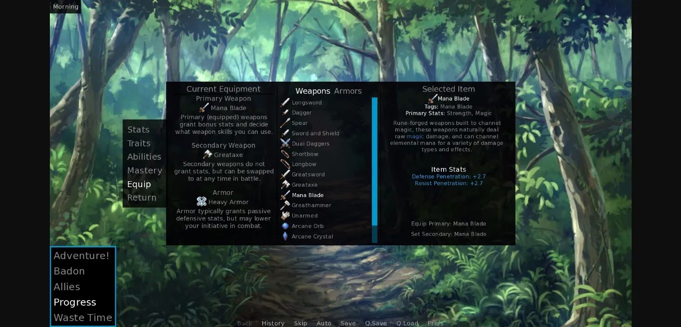 Divine Dawn is an adult RPG in which you step into the role of a would-be hero, with dreams of greatness and no likelihood of achieving any of them in a peaceful world with no real genocidal threats. Then you nearly die several times in a row, discover traces of an ancient mystery and (possibly) impending doom, and go on a road trip with a colorful cast of comrades to save the world! Maybe. You’ve got a lot of fighting, therapy, adventure, and monster girls to deal with before we get to that point. Fortunately, you’ll usually have a partner at your side to help you out in fights and offer witty(?) banter(?). But only you can decide if it’s worth trading your humanity for the power you need – otherworldly energies offer much, but will change your body over time.