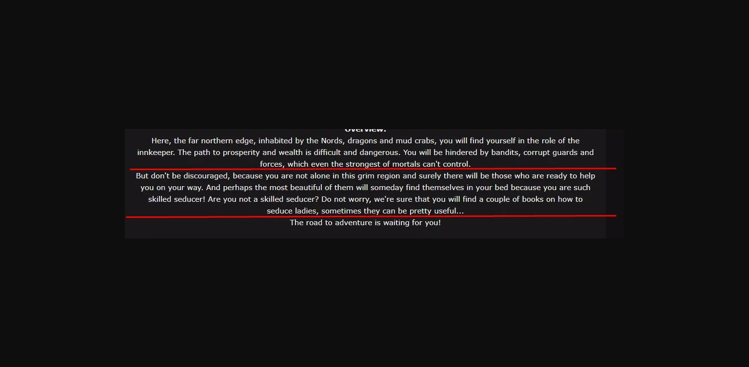 Here, the far northern edge, inhabited by the Nords, dragons and mud crabs, you will find yourself in the role of the innkeeper. The path to prosperity and wealth is difficult and dangerous. You will be hindered by bandits, corrupt guards and forces, which even the strongest of mortals can’t control.
