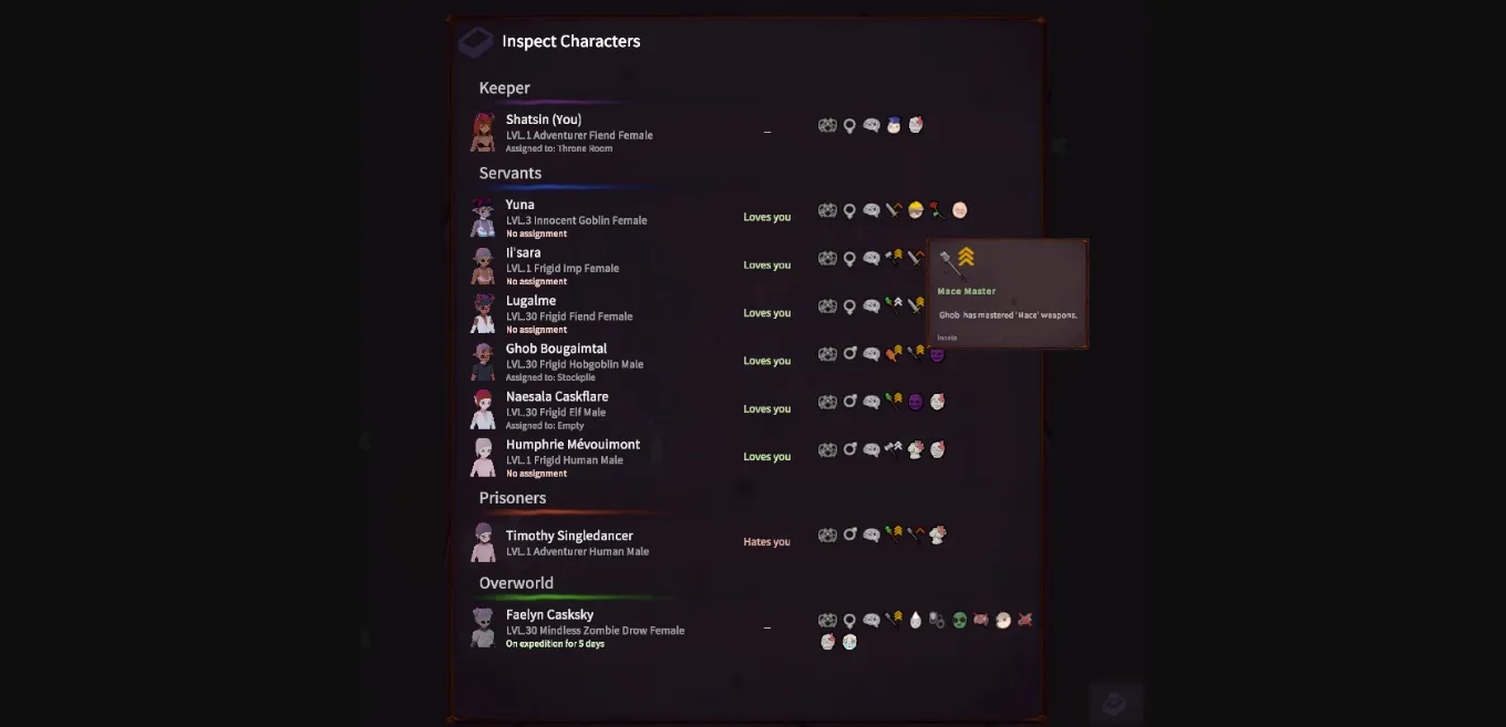 Characters can be allowed in Court or quickly summoned for a small chat by using the new Character Details panel, which also lists their equipment, genes, abilities and relations while still in dungeon management mode!